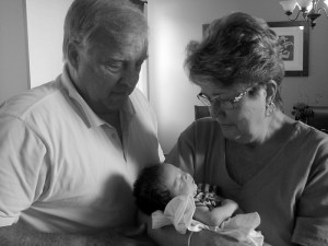 There are a few things I remember from my early childhood. One is when my dad would lay in bed on a Saturday morning and he would sit me on his chest to fall asleep. Apparently he still has the knack because Nolin was perfectly content in my dad’s arms and resting on his chest. I guess my dad has the gift of the hypnotic buddha…I think Nolin could have slept there the entire day if we let him. We have now discovered the 6th “S” to having the Happiest Baby On The Block “Send Him To THE Belly”. Well I have learned a lesson from the master and I am having some luck with this new technique albeit not as much as my father since he has had a few more years to develop his technique.
