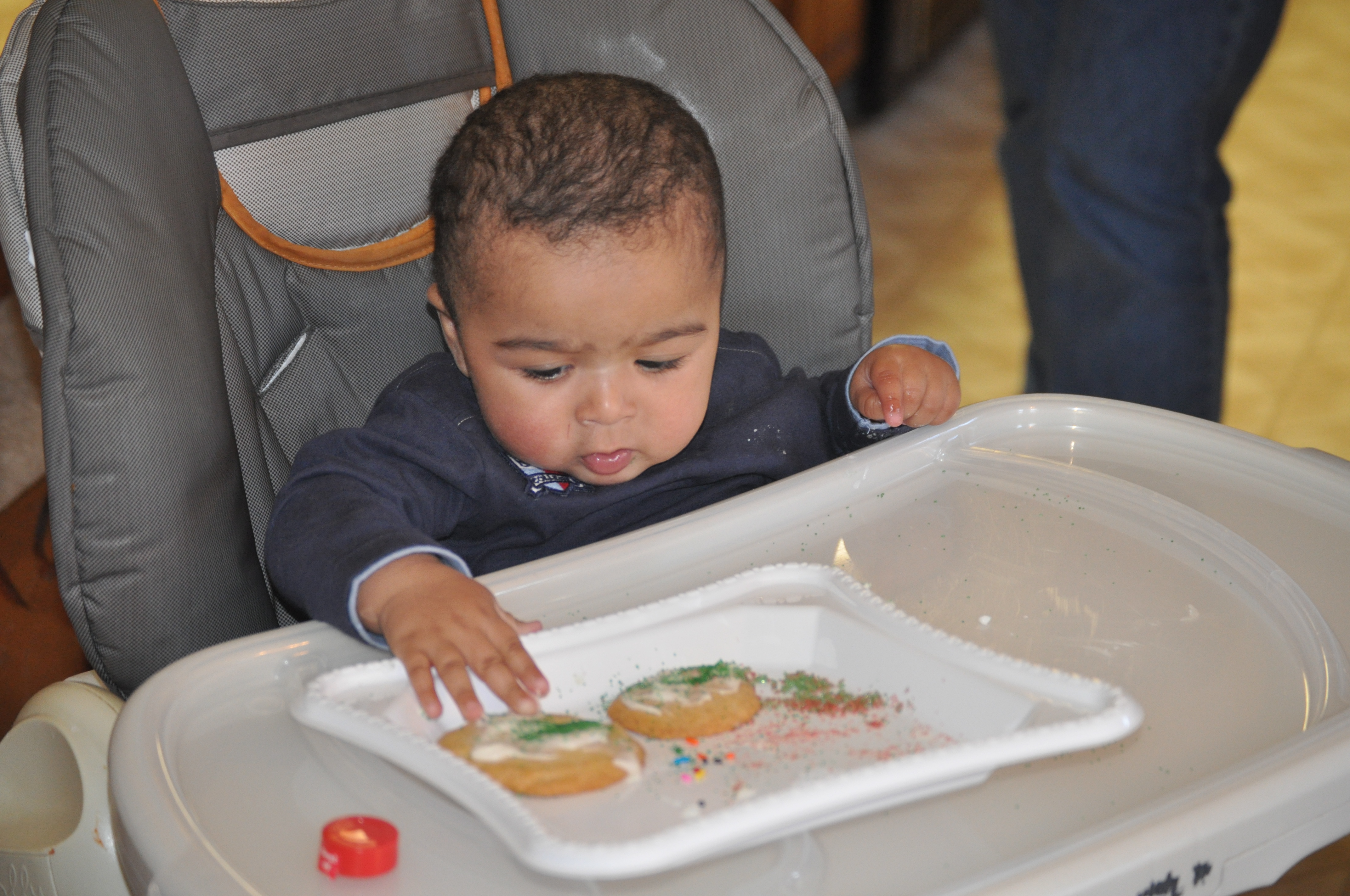 Thursday proved to be quite fun and overwhelming. In the morning, Nolin had a play date at our friend Kim’s house. She was brave enough to have six kids (ranging in age from 3 years to 11 weeks) over to make Christmas cookies. Actually let me rephrase that, she was kind enough to open her mother’s house up to six kids, frosting and sugar. Nolin wasn’t as interested in decorating cookies as he was in smashing his hands in the icing and then rubbing his face.