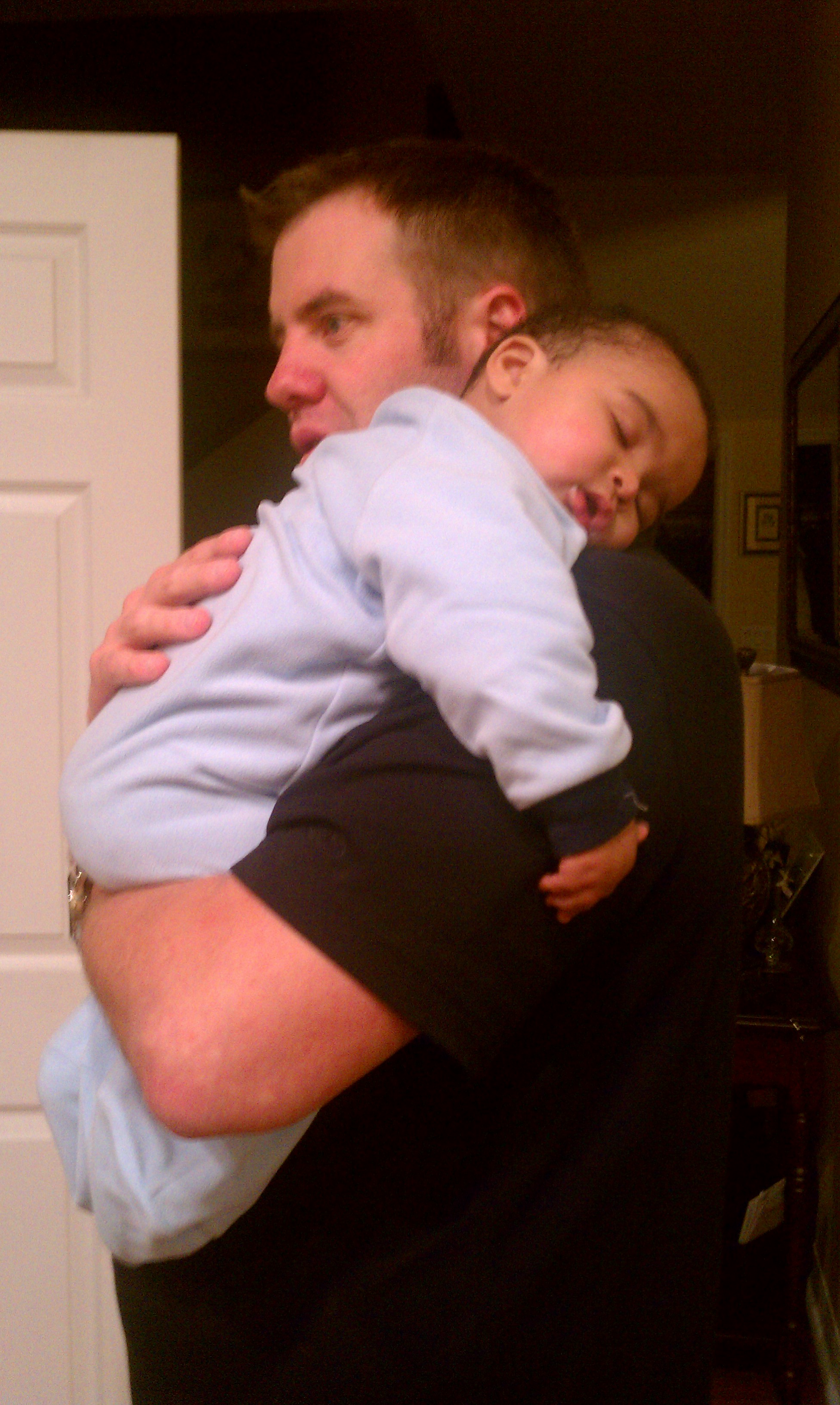 Finally after repeated trips by each of us in and out of his room (because again when a baby’s screaming no one’s sleeping) I finally went back in and just picked him up and pleaded my case. He grabbed on to me tightly and I sang Lionel’s words. Finally his eyes closed and as he fell asleep I was transported back to when I found that song to be such a great connection with my own father.