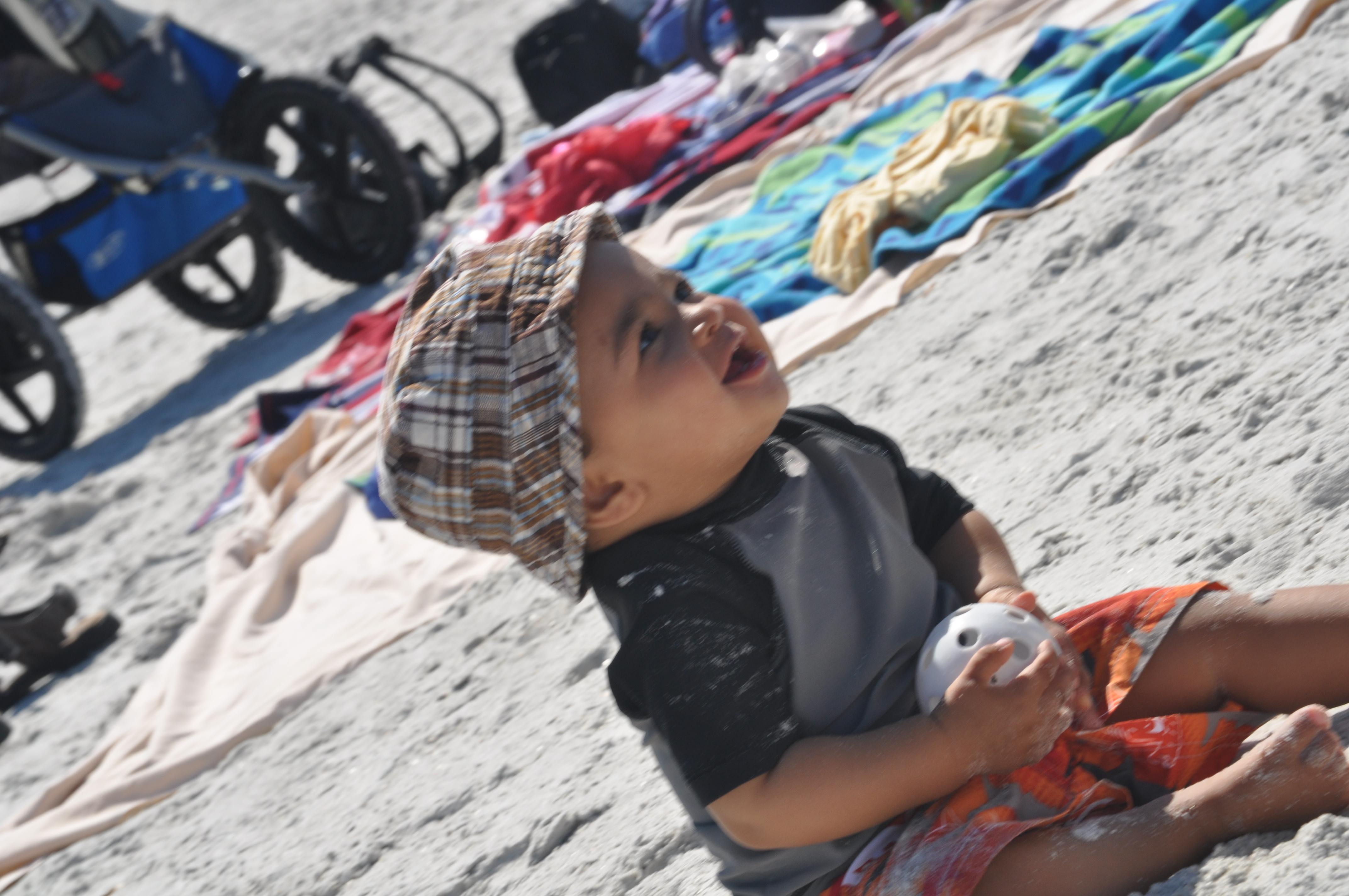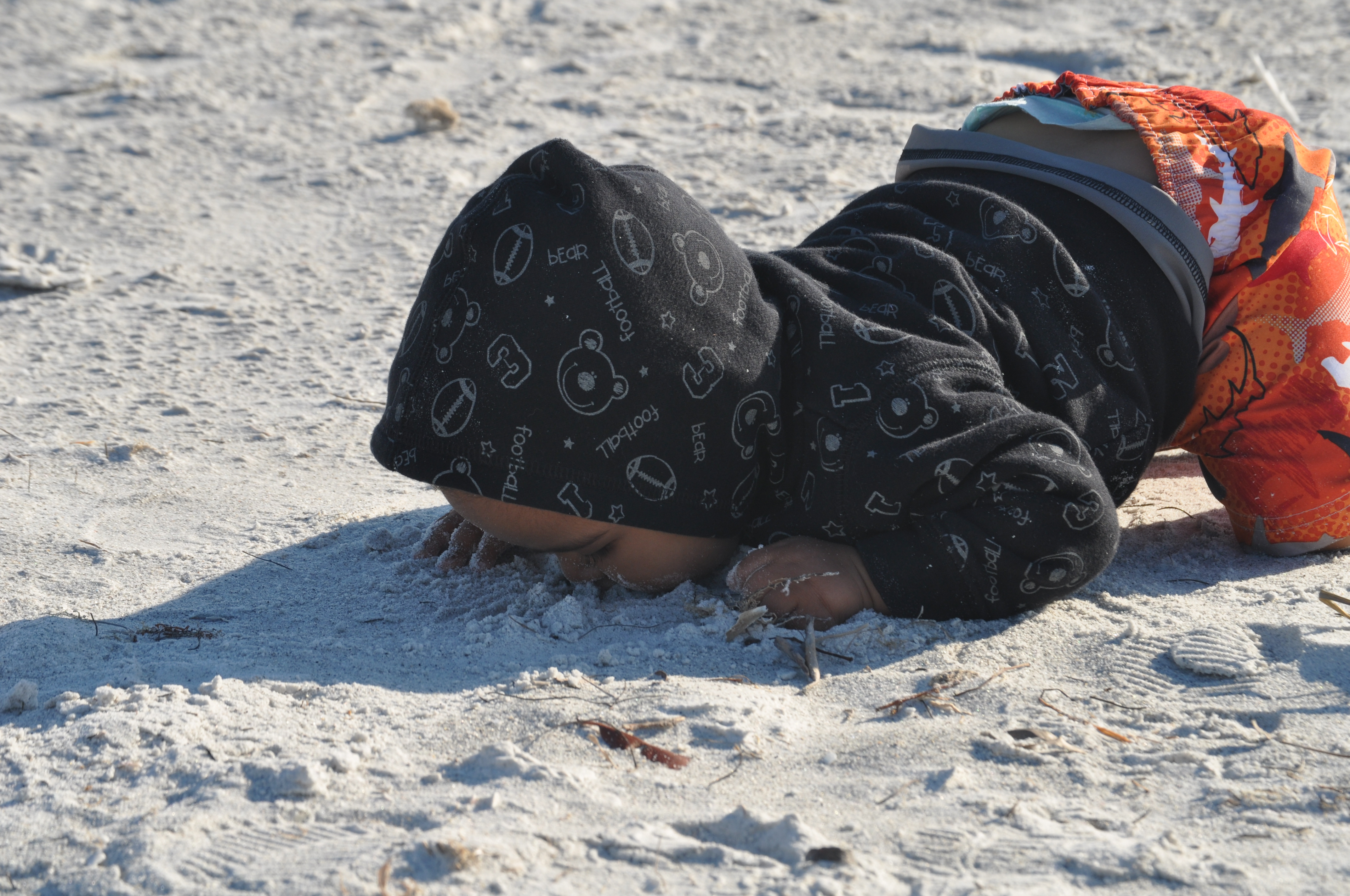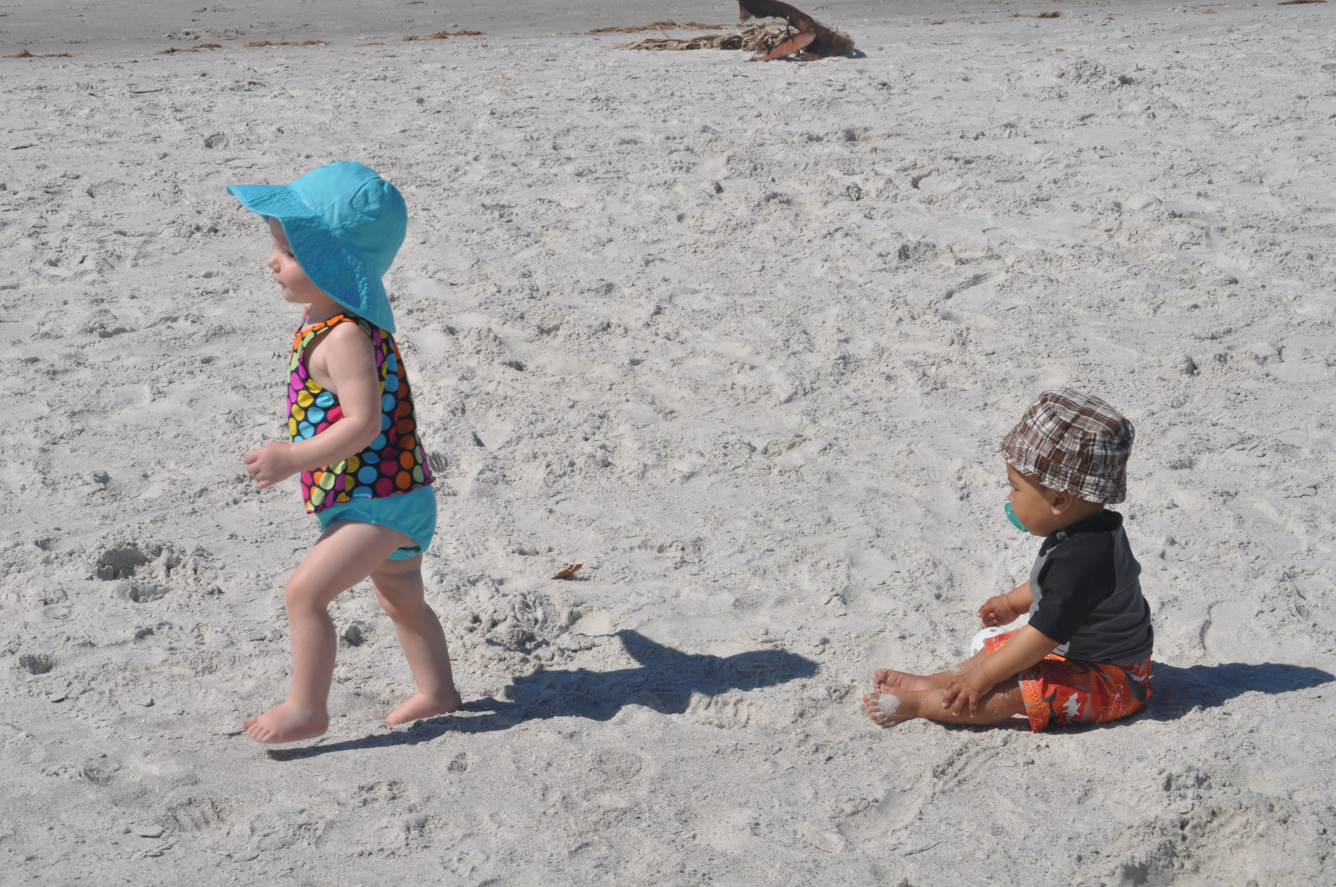 I guess Nolin is still at the age where he thinks that fart sounds and eating sand will impress the ladies, but apparently they do not. Because every time that Nolin would start crawling over to Nora she would get scared and run away from him. I guess I can’t blame her, if I was almost two and this kid with sand all over his face came quickly at me making monster sounds and laughing, I would probably be scared too.
