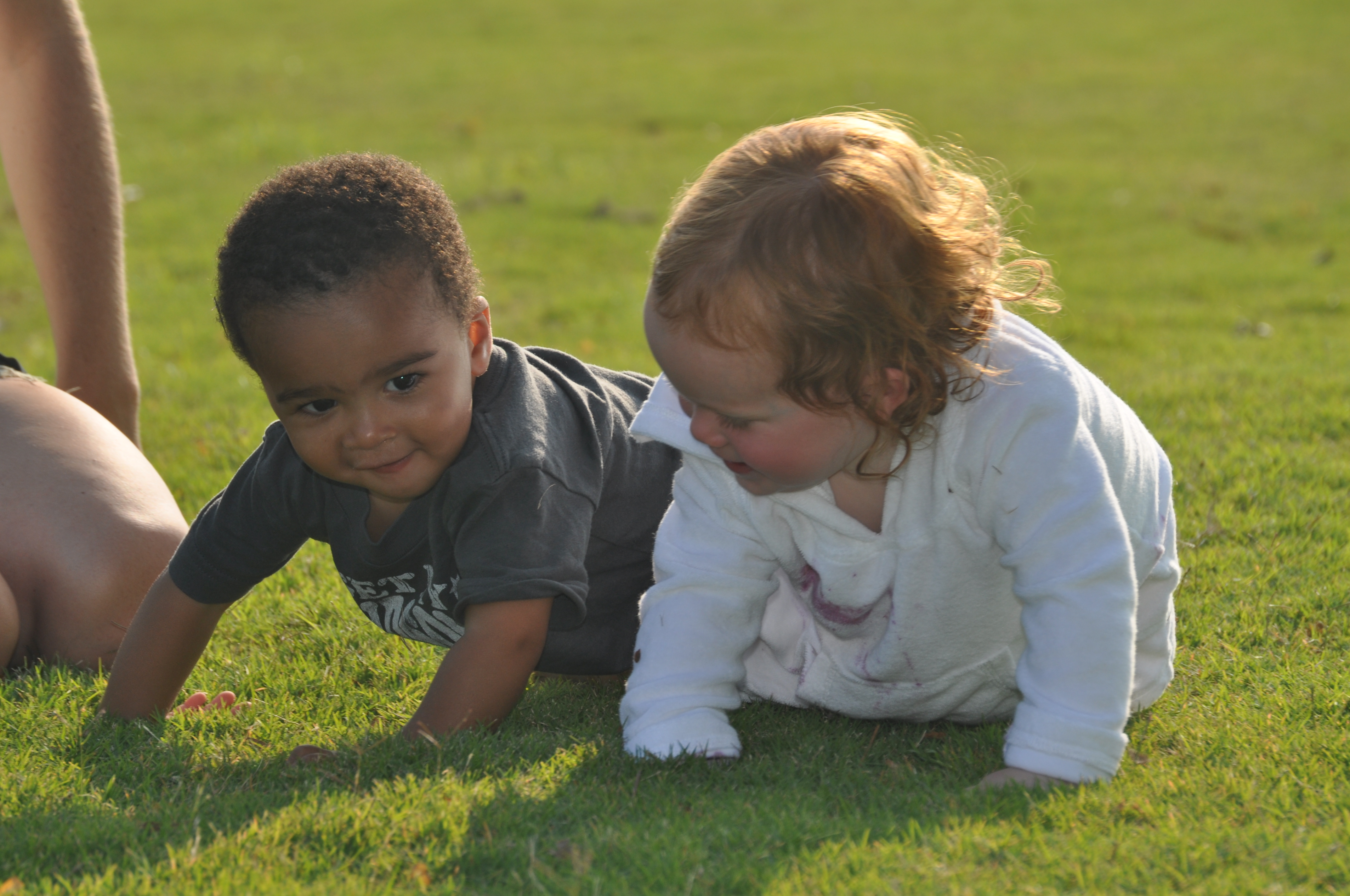 Nolin and Maggie took off running in the grass together. They were like two best friends. Maggie being a few months older, apparently caught Nolin’s attention and he walked over to her and put his arms out for her. Maggie walked over cautiously (because she’s a lady) and Nolin started to give her a hug.