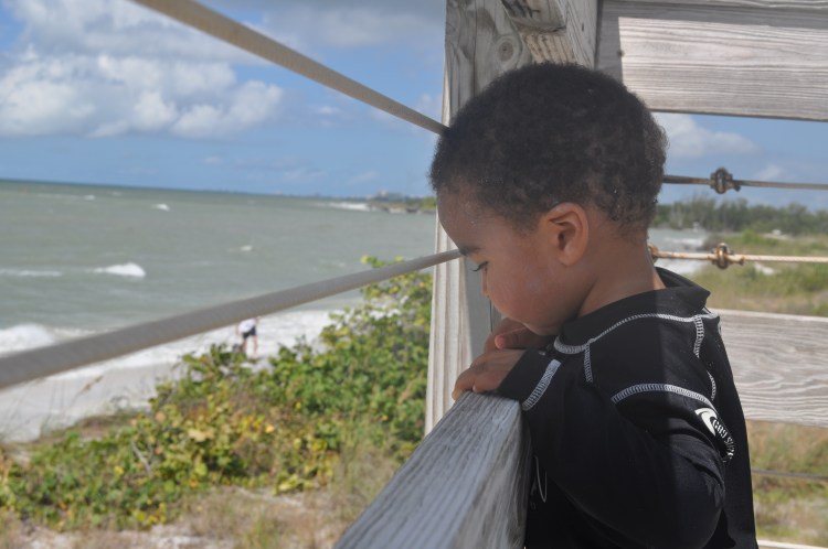 Looking for his friends the dolphins and the "big shark" that he met on the boat ride to the beach