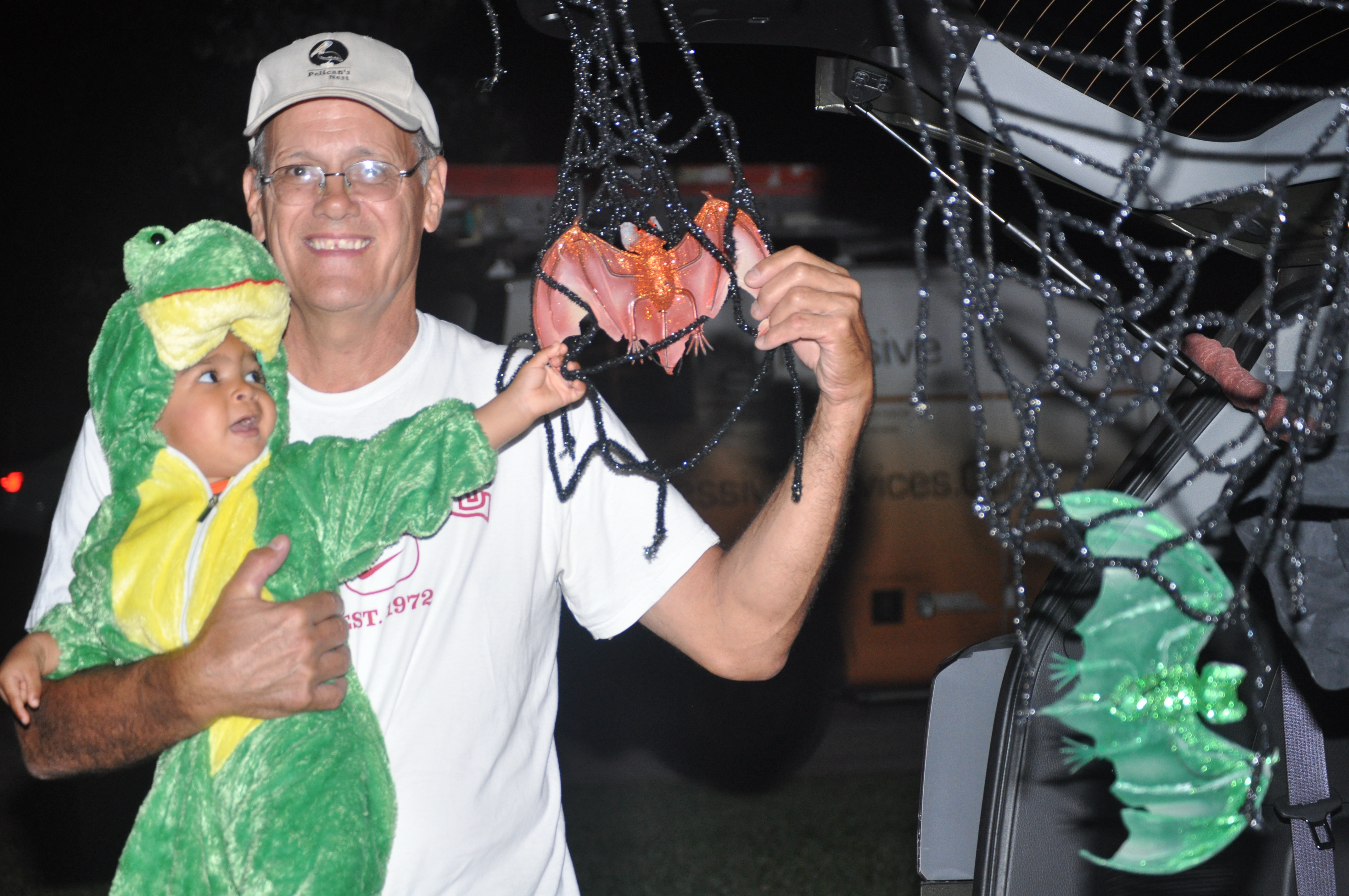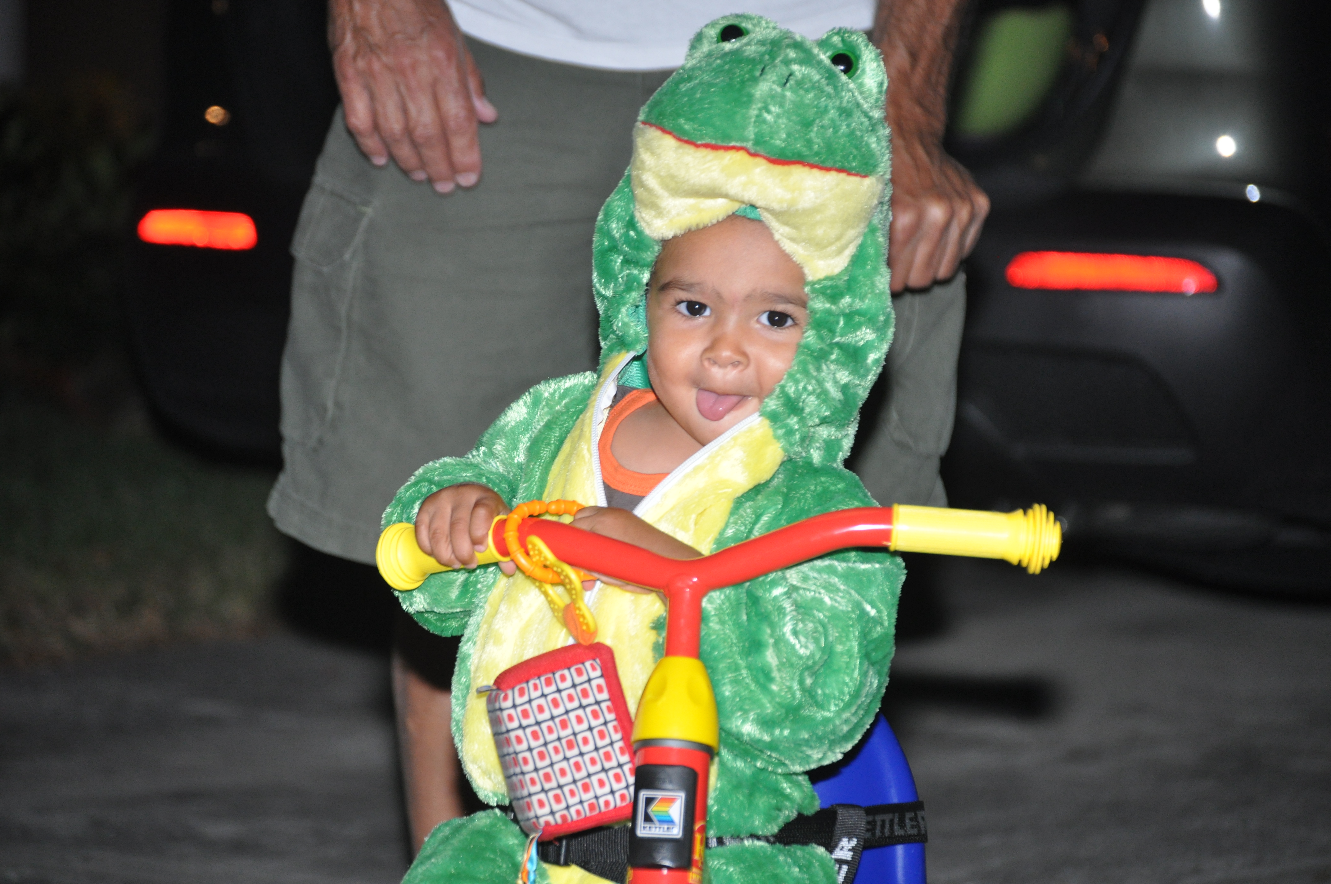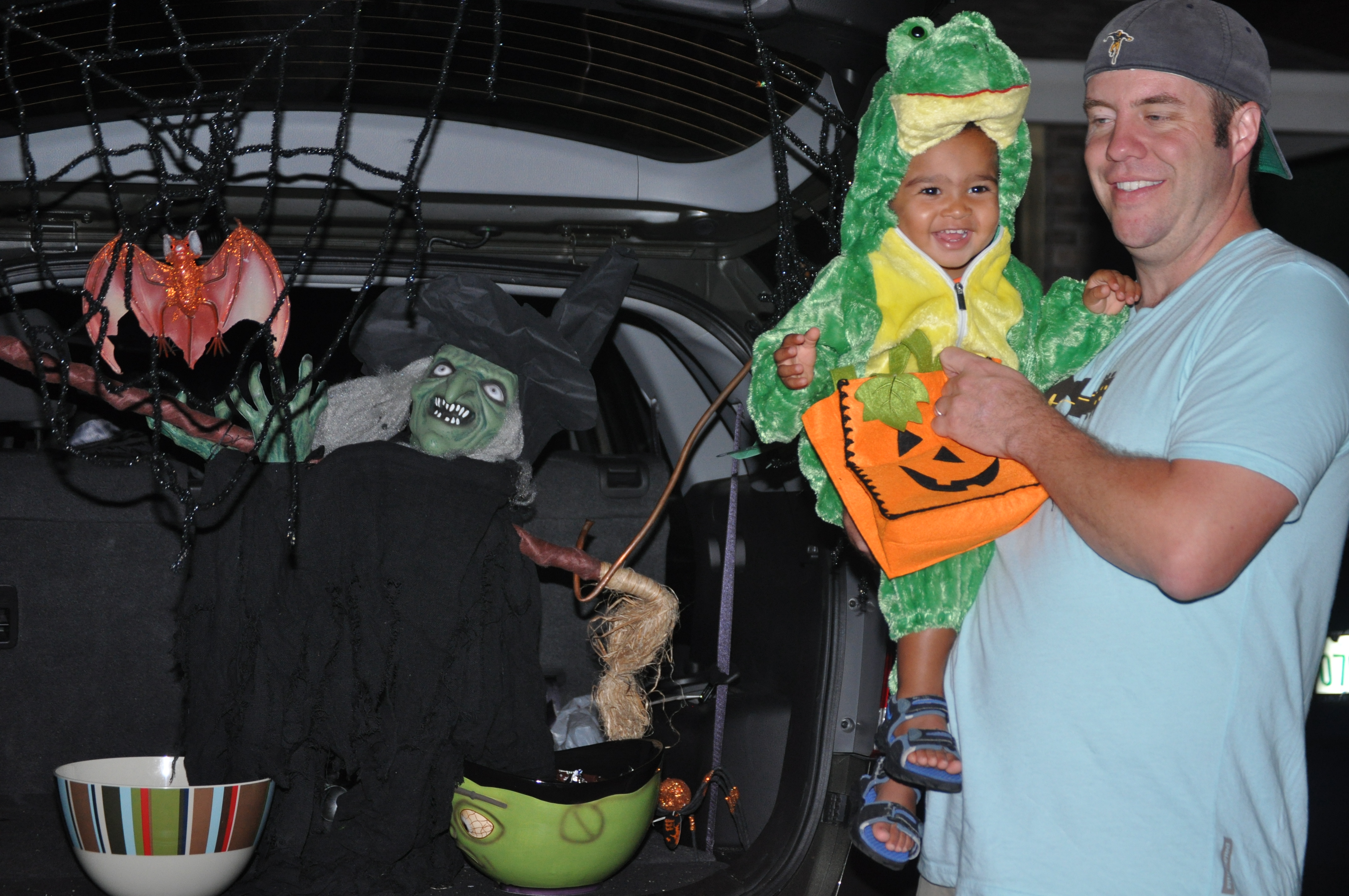 We got Nolin dressed in his scary Frog outfit and he loved it. As we finished decorating our trunk, Nolin climbed onto his bike ready to start trick-or-treating. Then all of a sudden we got hit with about 40 trick-or-treaters walking in a single file line down the sidewalk. It was like an assembly line distribution of Halloween candy. These large groups kept coming and coming. While it was exciting, I started getting nervous that the scary frog would never make it past the driveway nor have a chance to scare spirits and get candy (for his dad).