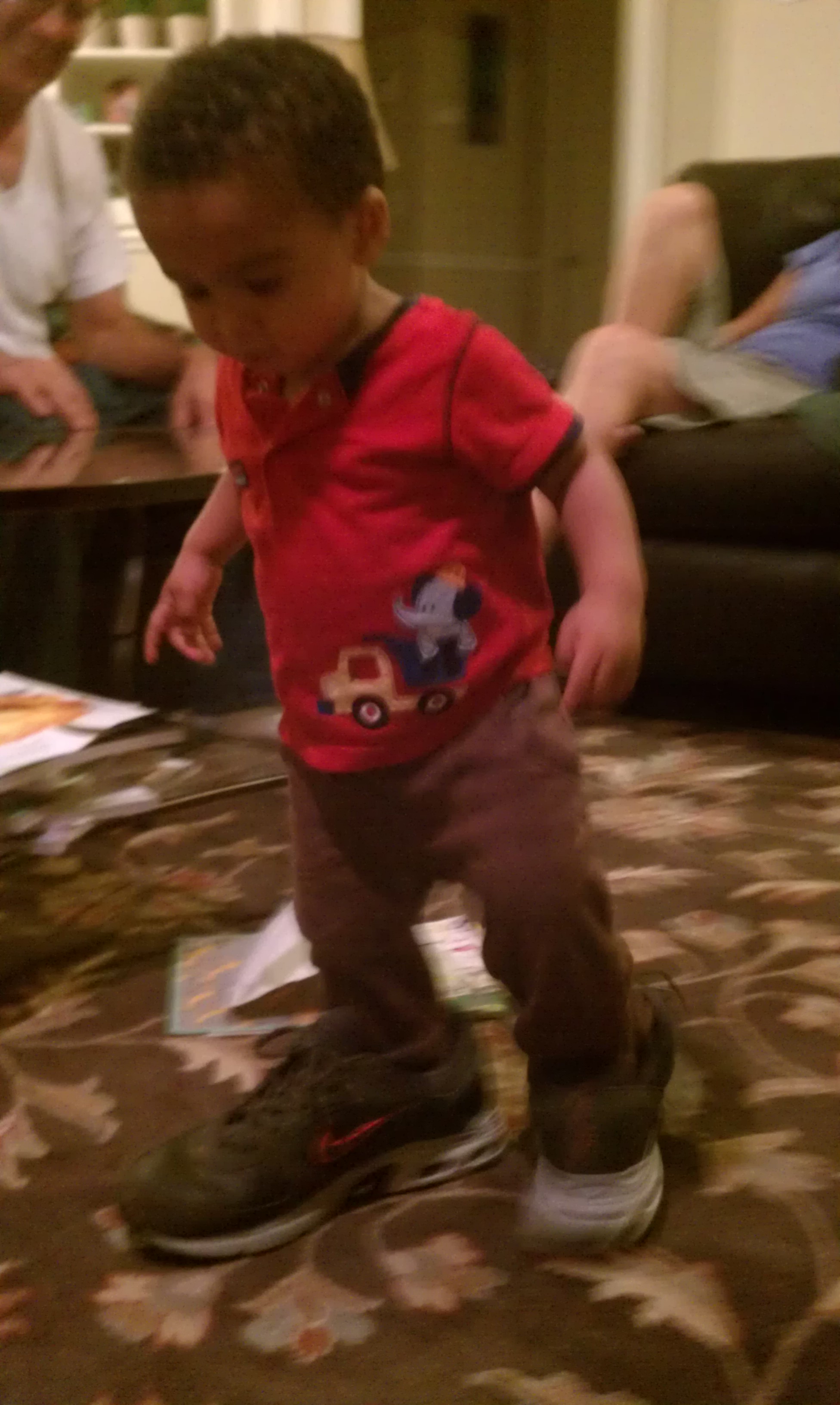 And old shoes…well those are a favorite pastime too. He loves to find other people’s shoes and announce Shoes On. Typically they are either Don, Teresa or my shoes. I am not sure if this is because he just likes our shoes better, or if we are the only ones who leave them out consistently, probably the latter. At the Irish Christmas party he did try to make off with a 3-year-old girl’s dress shoes who had taken them off to play in the park…that would have been an interesting one to explain.