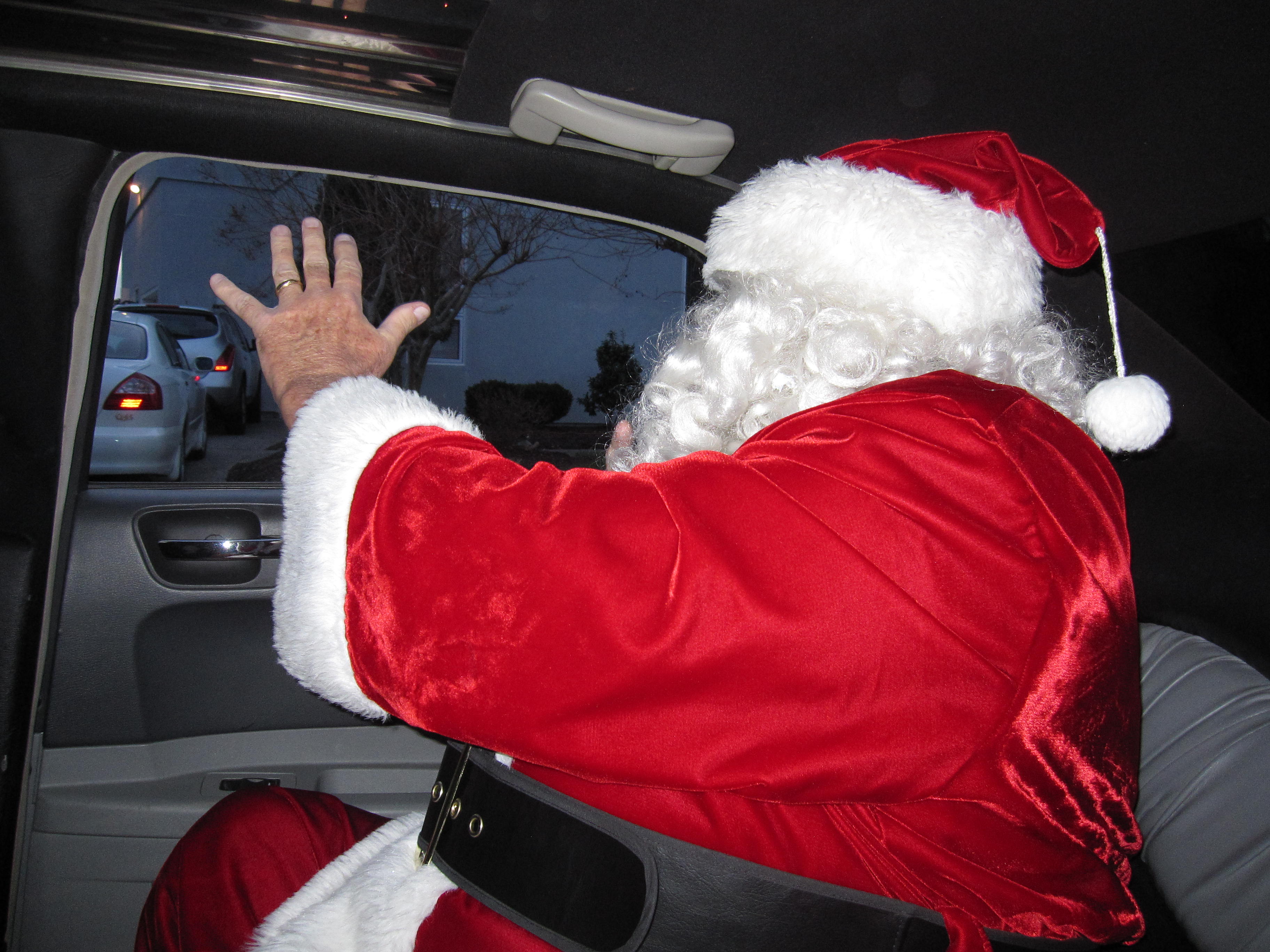 As cars piled up in the lanes to the left and right with last-minute Christmas shoppers, Santa’s crew quickly began filing out of the sleigh. The horns started honking, and windows rolled down as everyone began shouting Merry Christmas Santa…and he didn’t disappoint.