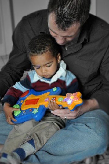 He bypassed everything else and sat down with a wooden puzzle. He would have been content with this, but we had to get the show on the road, so we began showing Nolin some of his other gifts. He didn’t tear through anything and move from toy to toy. Instead he sat down with each one and began exploring them as we would hand them to him. This meant Christmas morning would last a little bit longer than usual, which wasn’t a bad thing.