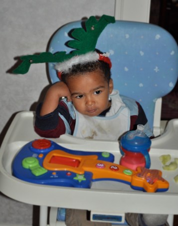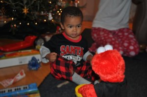 One of the funniest gifts was a little karaoke holiday microphone. I am pretty sure Nolin is going to be a hype man. He would start bouncing up and down and singing Jingle Bells (over and over and over again), but then in mid verse, he would hold the microphone out towards the crowd so that they could complete it. If they didn’t follow along, he would look slightly annoyed and finish the rest of the song. He kept trying to get Elmo to sing Jingle Bells and didn’t understand why he was not getting it, but he sat patiently and continued trying to teach him.