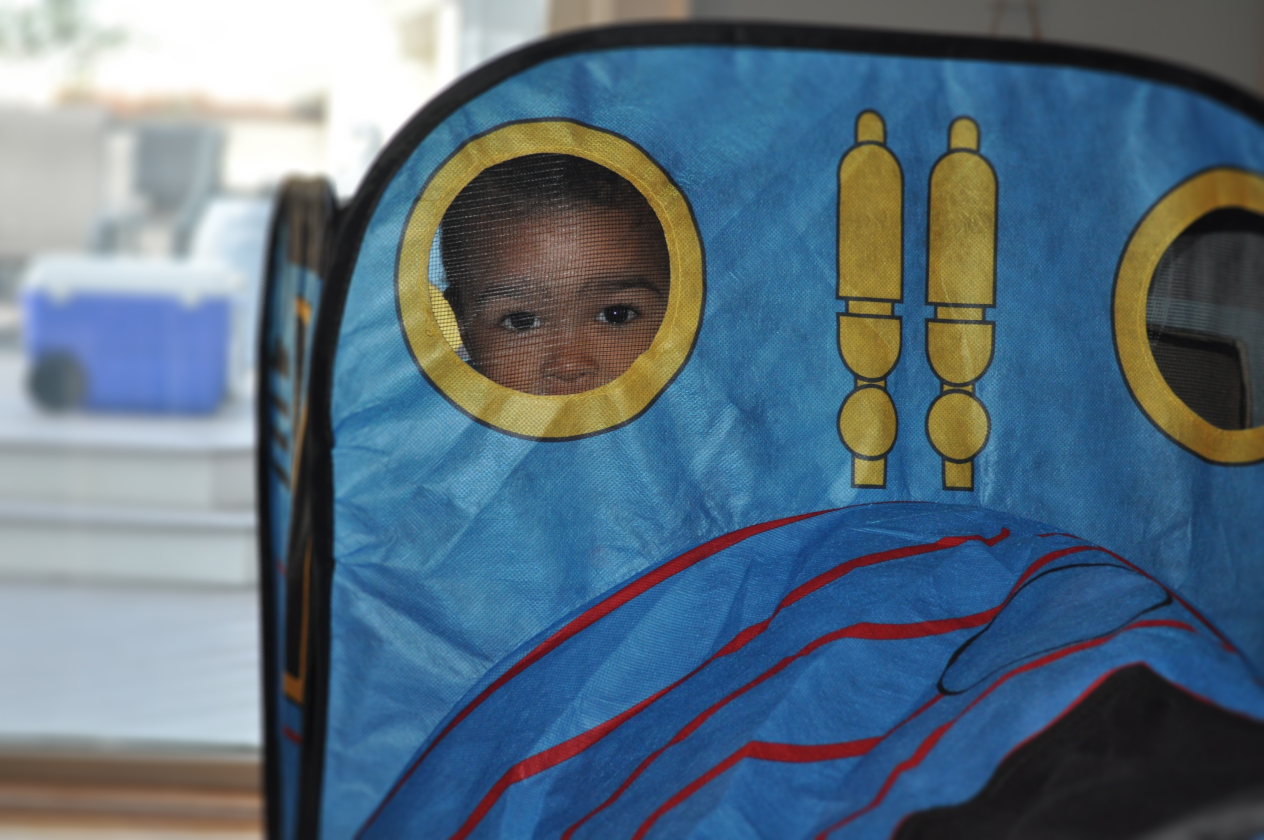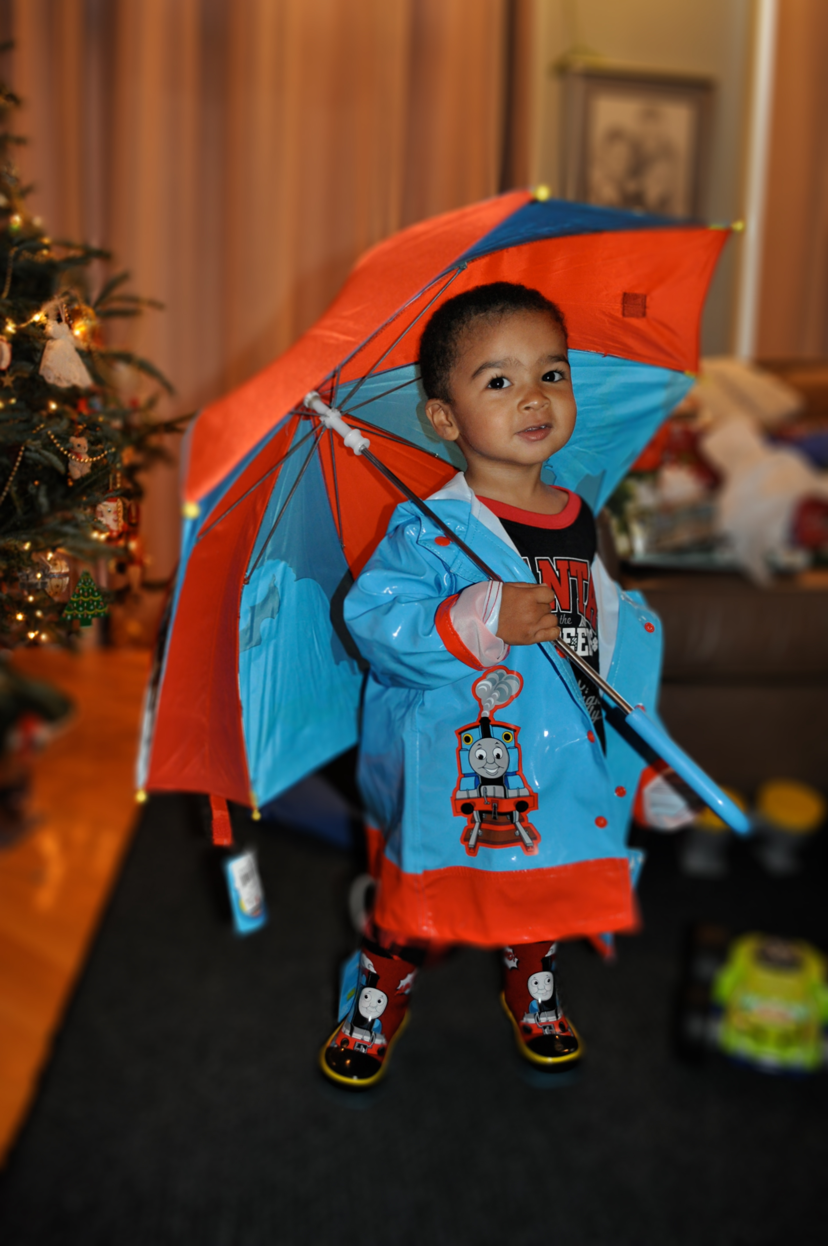 Aunt ELO made it a Thomas the Train Christmas giving him, galoshes, a raincoat, an umbrella, a lunchbox and a Thomas The Train tent. Needless to say Nolin was in heaven, and we would find that he loves to walk around in his new boots and say Chunga Chunga Chunga Chunga Choo Choo.