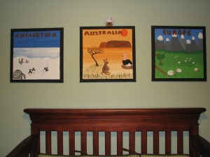 When I opened the door, Jenn continued I saw Nolin standing at the edge of his crib. He looked sad and said, “I’ve Broken Antarctica”. Jenn looked at him slightly confused until she noticed that the painting of Antarctica was now on the floor. (As a side note when Nolin was born we decorated his room with canvas paintings by one of Jenn’s students of each of the 7 continents. Before he goes to bed each night he likes to say goodnight to the animals and the continent in each of the paintings)