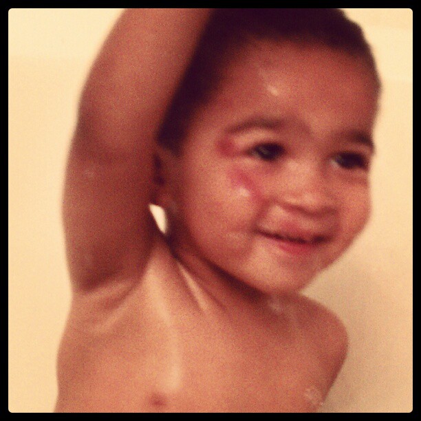 As I picked him up, he started crying and then the blood came. Nolin had a fight with the sidewalk and the sidewalk won. He got a nice road rash by his eye, down his cheek and to his lip. I quickly began hurrying home as I knew this was not one he would shake off in 30 seconds. But within a minute the crying stopped. We got home, and he immediately asked for Pizza…well I wasn’t going to deny him that.