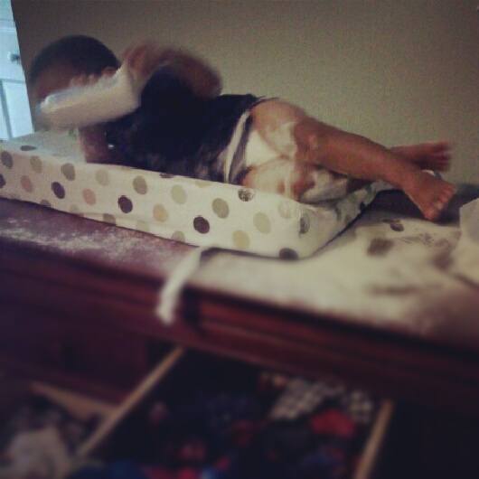 Nolin was on top of his dresser and he had the entire area (including himself) covered in baby powder. Nolin proudly exclaimed “All Clean” as Jenn entered the room. She had to turn around for a minute, remove the smile from her face and then pull out the parent card and tell Nolin that this behavior was not acceptable. All the while trying to hold it together and not laugh.