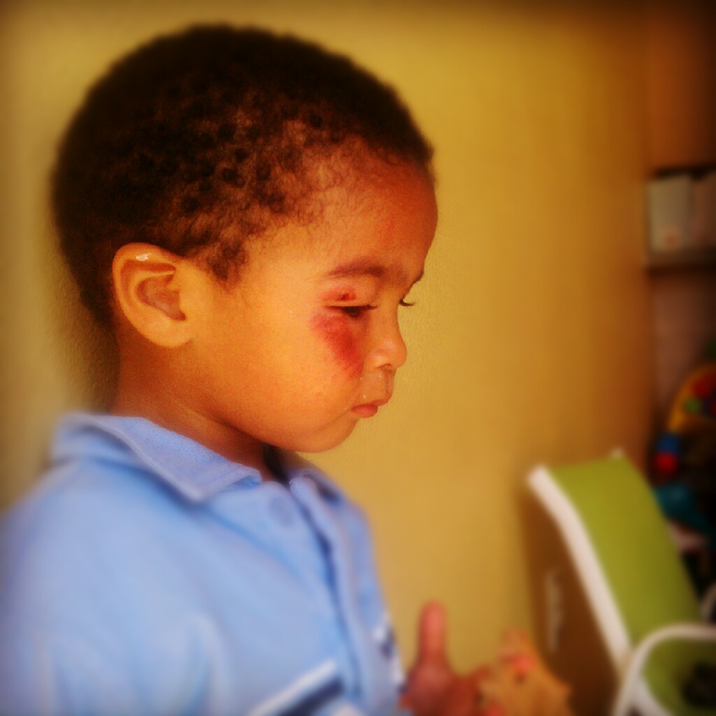 We ran inside to try to get ice on his eye, but he was not having it one bit. Not sure if it is because he didn’t understand what we were trying to do, or because he is tough as nails. Three minutes later, he was over it, and wanted to go back out to kick the soccer ball. Needless to say, this time we played in the back yard.