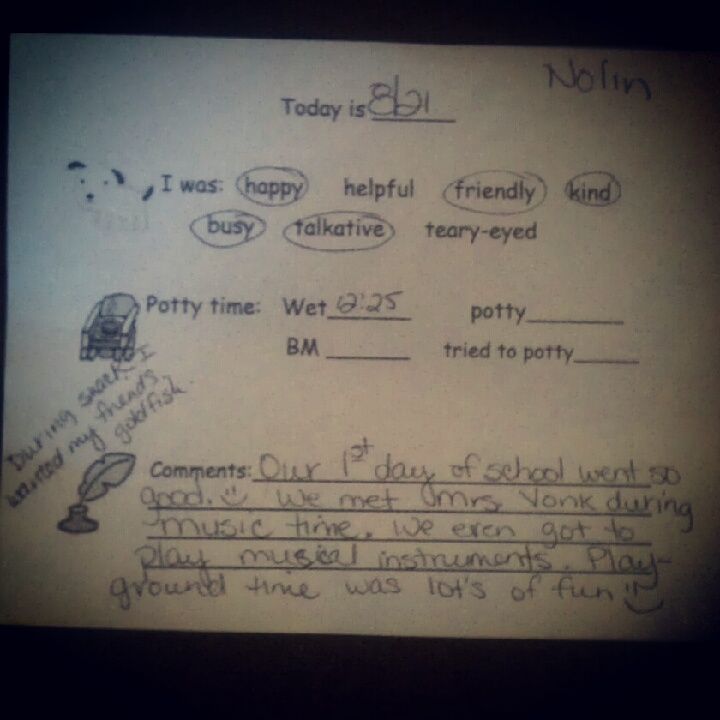 Post First Day Update: I received a call from Jenn a few hours after school finished to tell me about his daily report card. They can circle different choices to let you know how your child was in class. Today Nolin was:
