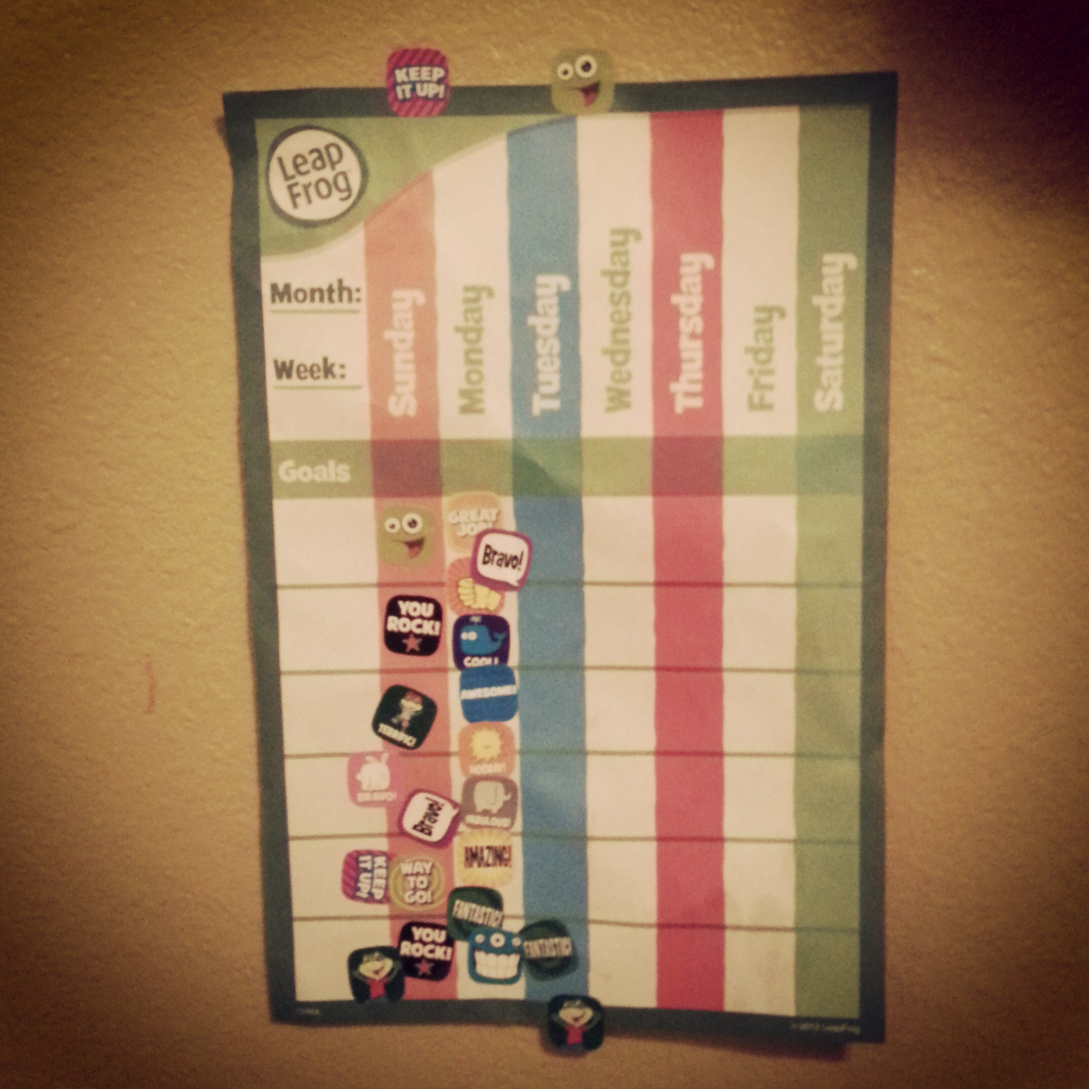 The funny thing is that we tried to encourage the behavior with M&M rewards (not a huge incentive to a kid who doesn’t really like candy) and iPad time and that didn’t work. What did work is an old-fashioned sticker chart and an excitement to flush the toilet.