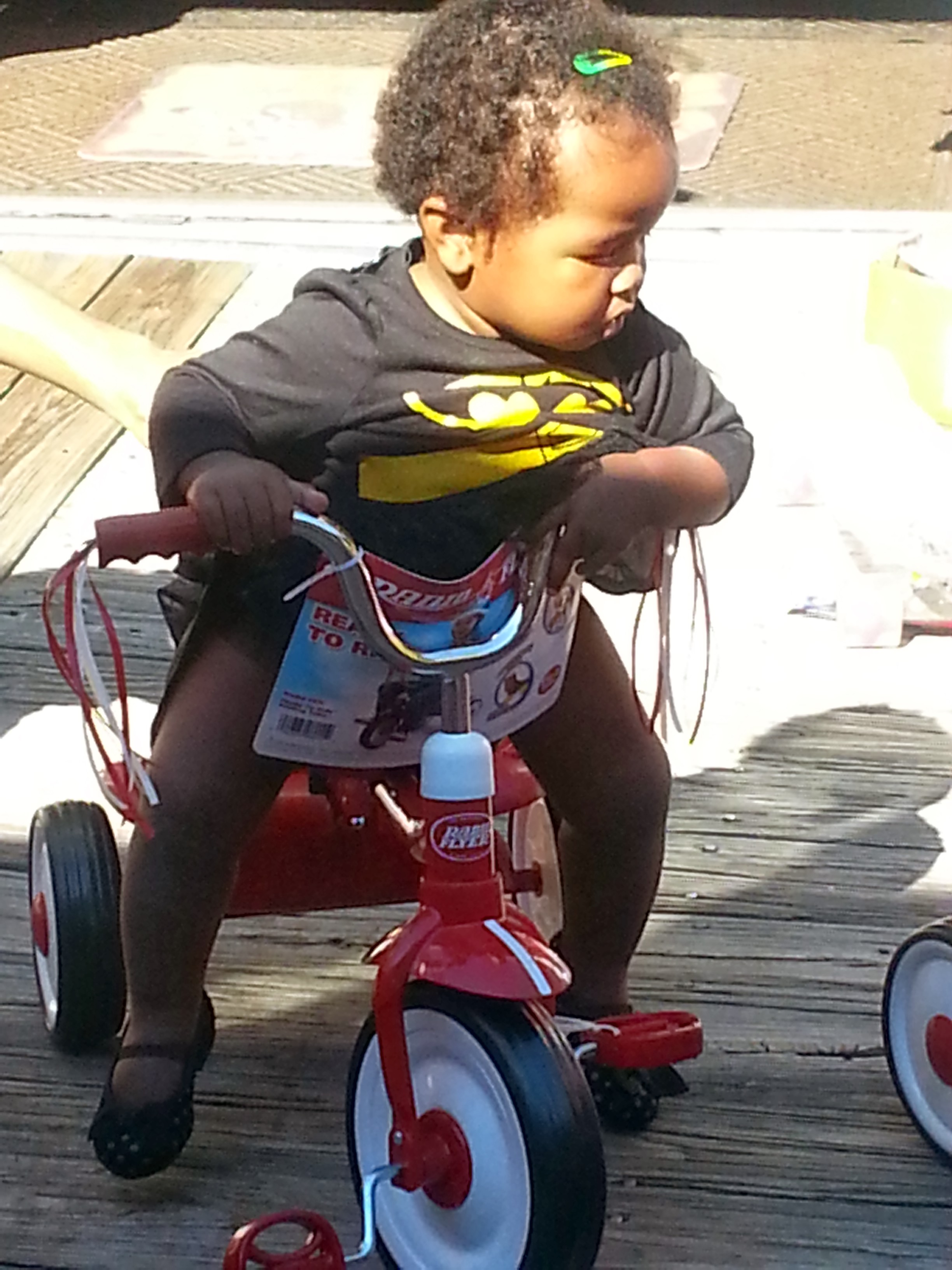 There were about 6 kids entered, and Grace won! We weren’t sure what that meant until they handed her a Radio Flyer tricycle…what?! Thanks Aunt ELO for the costume…score.