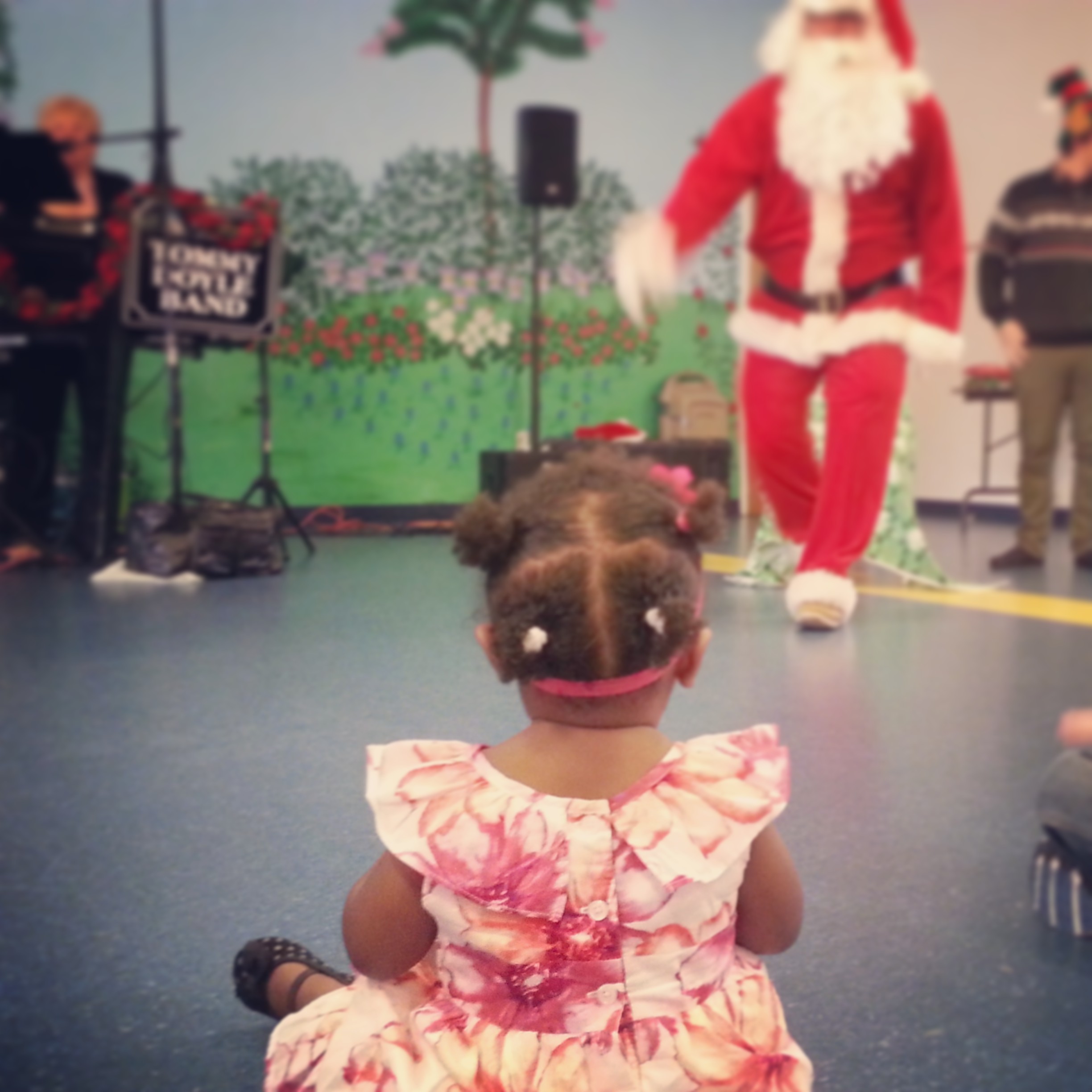 It started with the Irish Christmas party and Santa’s arrival. Nolin and Grace both sat patiently waiting their turn. Nolin pretended to be shy (for a second), but was excited to get his present. Grace took a moment, walked up to him and just started staring at him…not scared of him, but not really sure what to think of him. Regardless, she was excited to get her present too.